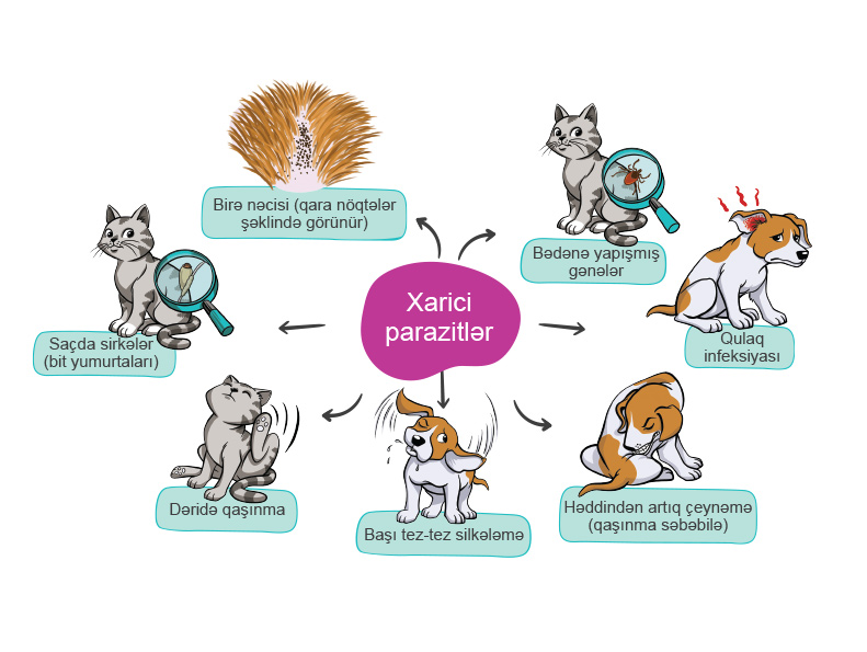 Bizim ev heyvanlarımız il boyu xarici parazitlərə yoluxma riski altındadır. Ən çox it və pişiklərə sirayət edən birə və gənə ilə yanaşı, ağcaqanad, gənə və bit kimi müxtəlif növ dişləyən həşəratlar da problem yarada bilər. Xarici parazitlər ev heyvanlarını qıcıqlandıra, müxtəlif dəri problemləri yarada, həm heyvanlara, həm də insanlara xəstəliklər ötürə bilər.